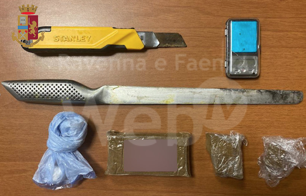 Nel corso del controllo e della successiva perquisizione gli agenti hanno rinvenuto e sequestrato una bilancina elettronica di precisione, quattro involucri di materiale plastico, di cui tre contenenti circa 140 grammi di hashish e uno di circa sei grammi di cocaina, un coltello e un cutter.