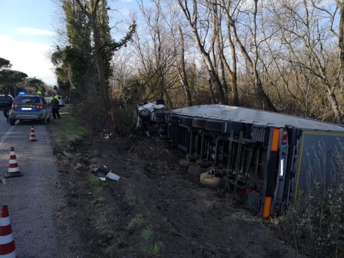 Questa mattina personale della Protezione civile regionale, dei Mistral e dei Vigili del fuoco ha provveduto a posizionare attorno a un mezzo pesante carico di legname uscito di strada nella tarda serata di ieri lungo la Romea, all’altezza del ristorante Cà del Pino dalla parte di Punte Alberete, panne assorbenti che contenessero il gasolio fuoriuscito da uno dei due serbatoi del mezzo.