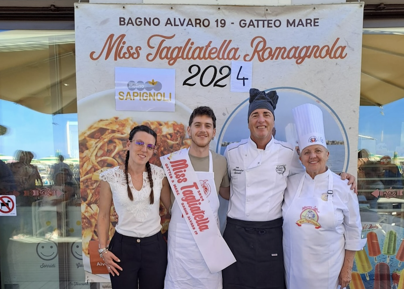 Grande successo per il pomeriggio di festa, legato alle tradizioni della cucina romagnola, che si è tenuto al Bagno Alvaro di Gatteo Mare – Riviera Romagnola (di cui è titolare la famiglia Spinelli), per l’edizione 2024 di “Miss Tagliatella”, il consueto appuntamento estivo, ideato dalla Lady Chef Albarosa Zoffoli ed organizzato dalla Direzione del Bagno Alvaro e dal ristorante “il Mare in Pentola” di Gatteo Mare. L’evento, seguito da un numeroso pubblico, è stato condotto da Paolo Teti. Sedici concorrenti in gara (donne e uomini), di diverse province italiane, con la partecipazione di altre nazioni, come Olanda, Turchia ed Australia, che sotto la guida degli Chef Zoffoli e Spinelli, a colpi di mattarello, farina e uova, hanno preparato poi “tirato” a mano la sfoglia (come facevano una volta, le nostre nonne) e si sono sfidati per preparare la migliore tagliatella, la “Miss Tagliatella” appunto, uno dei piatti più amati dagli italiani!.