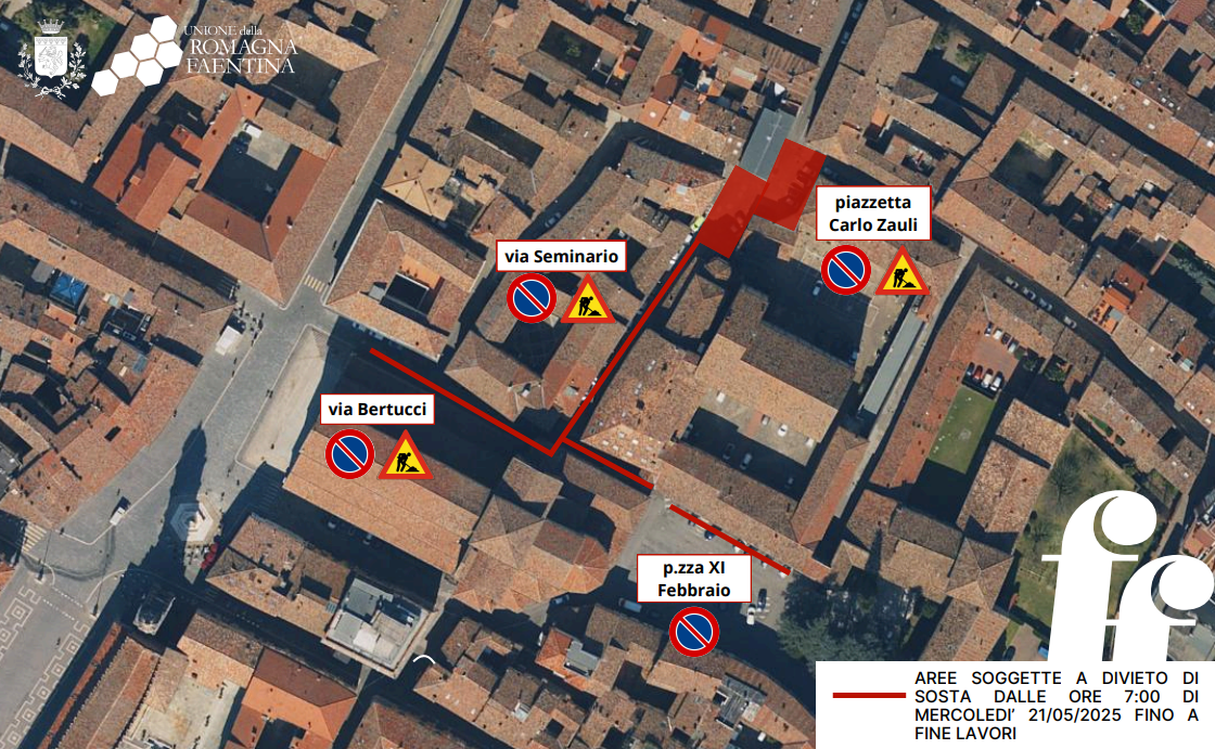 Dalle ore 7.00 di mercoledì 21 alle ore 18.00 di venerdì 23 maggio, per lavori di rifacimento del manto stradale, saranno in vigore alcune modifiche alla viabilità. In via Bertucci, via Seminario e piazzetta Carlo Zauli: divieto di transito e di sosta con rimozione forzata. Piazza XI Febbraio (lato Vescovado): divieto di sosta con rimozione forzata negli stalli dedicati. Nelle vie adiacenti (via Emiliani, via Pezzi, via Sarti), la circolazione sarà gestita da movieri e segnalata da apposita cartellonistica. Compatibilmente con l’avanzamento dei lavori, residenti e frontisti riceveranno indicazioni sui percorsi alternativi per raggiungere le proprie abitazioni. Si precisa che, in caso di maltempo, le date di esecuzione dei lavori potrebbero subire variazioni.