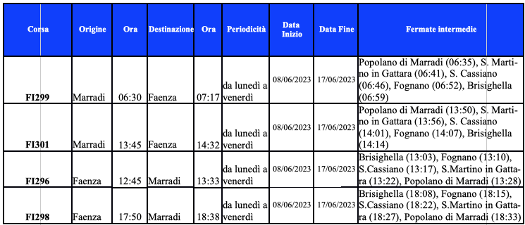 A seguito pertanto della chiusura della SP302, da domani giovedì 8 giugno sarà attivato un servizio di trasporto sostitutivo per la tratta Marradi-Faenza, come riportato nella tabella sottostante.