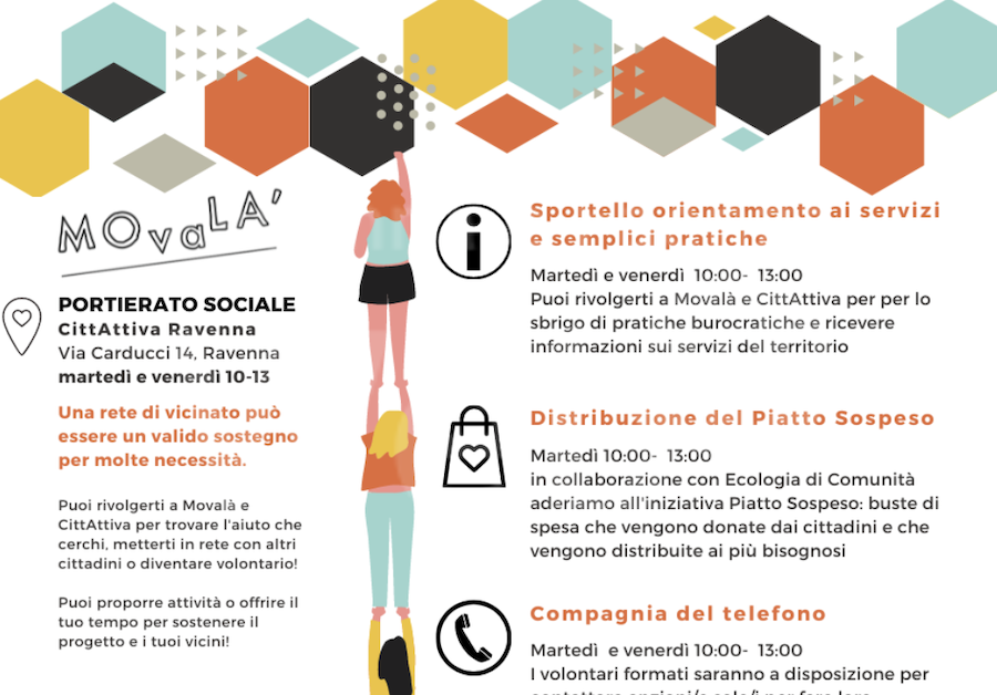Movalà! nasce 3 anni fa all’interno del servizio CittAttiva, la sede della partecipazione civica che VillaggioGlobale gestisce per il Comune di Ravenna, ed è un progetto rivolto alle persone in difficoltà (anziani, persone sole, immigrati, persone non autosufficienti, famiglie numerose o in difficoltà economica) che un gruppo di volontari e operatori sociali sostengono sia nello sbrigo di alcune pratiche burocratiche, sia nel creare nuove relazioni d’aiuto e per ascoltare al telefono anziani soli o in condizione di solitudine della nostra città contattati all’interno del progetto La Compagnia dei Racconti.