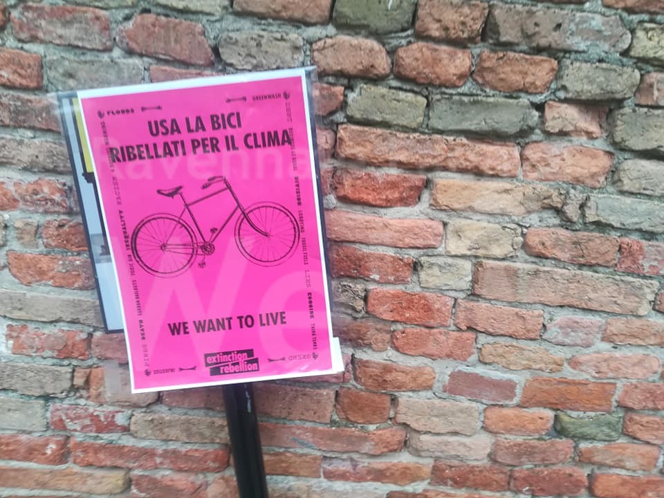 A dicembre 2020, il neonato gruppo Extinction Rebellion Faenza aveva attaccato una decina di locandine lungo le vie della città “per sensibilizzare sulla crisi ecologica e climatica, ringraziando e incentivando chi si muove in bici”.