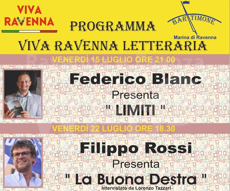 Viva Ravenna ha intenzione di scendere fra la gente ed organizzare eventi concreti per dare un volto nuovo ed un futuro diverso e più vivo alla nostra città ed ha deciso di esordire fin da subito sfruttando la stagione estiva e proponendo incontri letterari nel corso dei quali verranno presentati quattro libri di altrettanti autori.