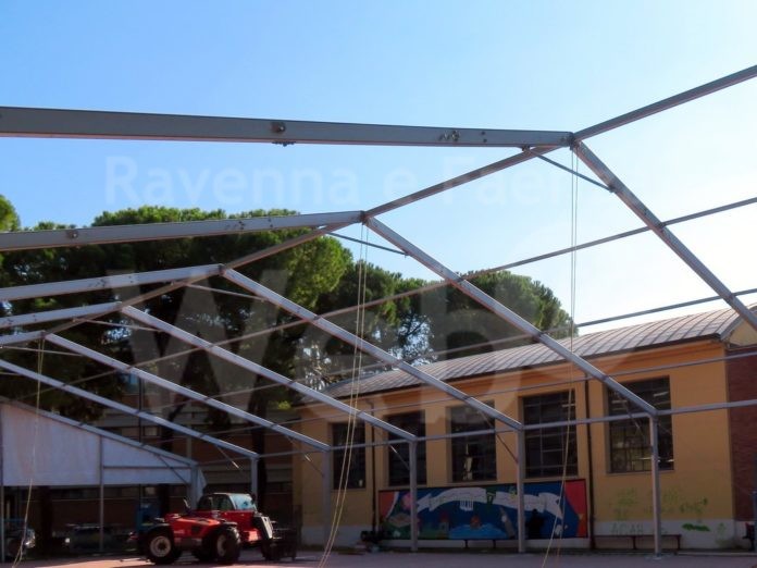 Da questa mattina, mercoledì 13, nel cortile esterno della scuola media Cova-Lanzoni, che fa parte dell’Istituto Comprensivo Matteucci, sono iniziate le operazioni di montaggio della tensostruttura destinata ad accogliere un’area al coperto destinata ad attività sportive. L’impianto è stato affittato per l’intero anno scolastico con risorse, 85mila euro, arrivate dal Ministero della Pubblica Istruzione, assegnate attraverso un Decreto del direttore generale del Miur, dopo che l’amministrazione manfreda aveva partecipato a un bando specifico proprio per poter dotare gli istituti scolastici di strutture temporanee a nolo. Dopo l’esperienza positiva degli anni passati, nel 2018 si fece una prima sperimentazione in questo senso, era emersa la necessità di riallestire la struttura coperta sempre negli stessi spazi, quindi nel perimetro del cortile esterno della scuola di via Martiri Ungheresi, anche per via della sua posizione particolarmente centrale e quindi logisticamente comoda.