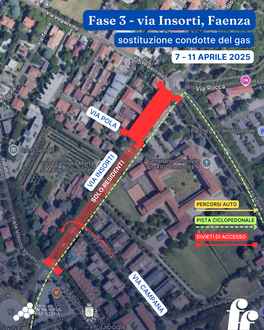 I veicoli a motore che si immettono in via Insorti provenienti da via Campana, dalla scuola media Europa e dal parcheggio ex sede della Polizia Locale al civico 2 dovranno obbligatoriamente svoltare a sinistra verso l’incrocio dei Cappuccini.