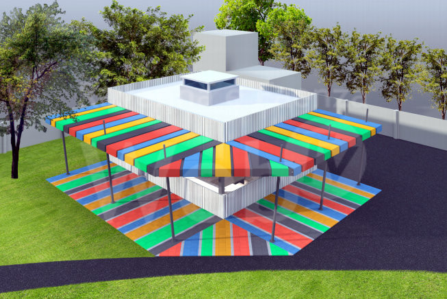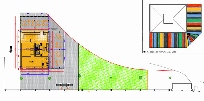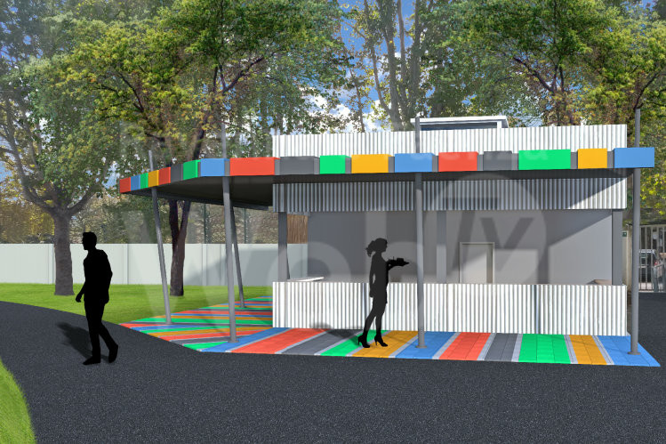 Alla nuova struttura di bar e ristorazione ad un unico piano inferiore a 50 metri quadrati, verrà affiancato un dehors. Si è scelto caratterizzare la struttura con una copertura e una pavimentazione del dehors che richiami i colori dei Rioni.