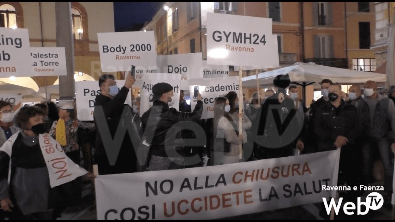 Alle ore 18 è iniziata la manifestazione in Piazza del Popolo organizzata dai titolari di alcune palestre di Ravenna, che hanno deciso di fare fronte comune per protestare contro l’ultimo Dpcm firmato dal premier Giuseppe Conte che prevede, oltre alla chiusura di bar e ristoranti alle ore 18 anche lo stop di piscine e palestre. In tantissimi hanno preso parte alla manifestazione, e oltre ai titolari di centri sportivi erano presenti anche alcuni imprenditori del ramo della ristorazione.