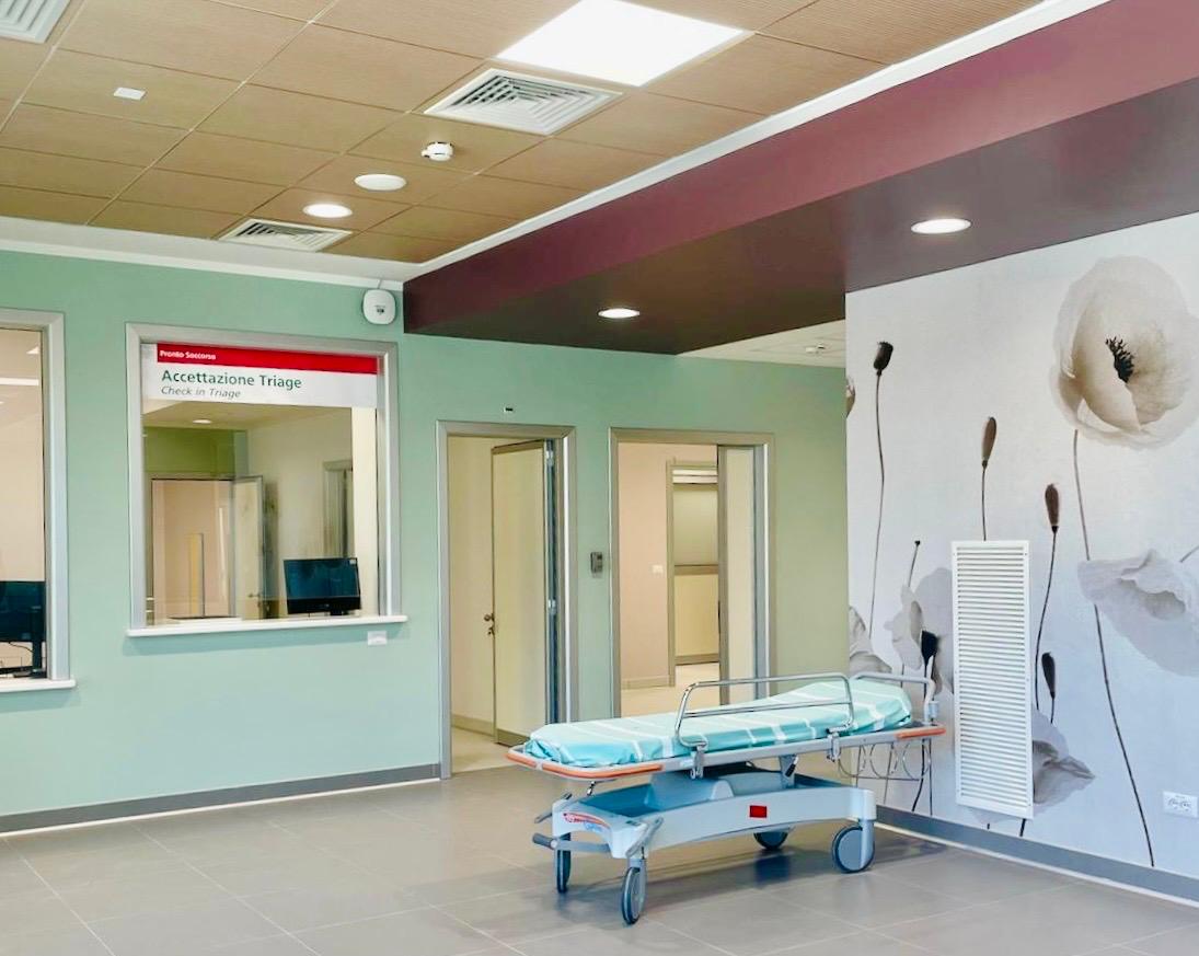 • la nuova area Accettazione – Triage costituita da una accettazione suddivisa in due punti di accoglienza, uno per pazienti deambulanti e uno per pazienti in barella, tre box di visita per accogliere fino a 4 pazienti, un locale bonifica, una zona d’attesa per pazienti deambulanti e relativi servizi oltre che un locale di pre-triage in caso di eventi pandemici;