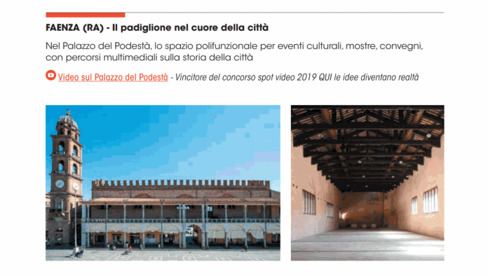 Tra i 19 edifici che hanno ricevuto il finanziamento e che quindi trovano spazio nella brochure, anche Palazzo del Podestà di Faenza con il Salone dell’Arengo, spazio molto caro alla memoria dei faentini che, dopo un profondo intervento di recupero strutturale e conservativo curato dai tecnici del Servizio edifici pubblici del Settore Lavori Pubblici del Comune di Faenza, sarà presto destinato a diventare luogo polifunzionale culturale, un contenitore per mostre ed eventi pubblici inserito nel cuore della città proprio di fronte a Palazzo Manfredi, sede del Comune di Faenza. Il percorso per ultimare l’intervento, giunto al suo step definitivo è ormai in dirittura d’arrivo e l’inaugurazione è prevista per l’autunno. Il recupero di quell’edificio porterà nella piazza principale della città la possibilità di poter disporre di uno spazio rigenerato a servizio della cultura e del turismo. La cura di quei luoghi porterà inoltre a una riqualificazione generale dell’area circostante che potrà essere messa a disposizione della città nell’ottica di una maggiore razionalizzazione degli spazi urbani.