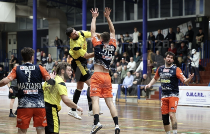 Anche i primi 15’ della ripresa restano appesi ad un filo, ma i gialloneri possono sfruttare la verve (e il talento) di Stabellini, a riposo nella prima parte di gara. Il primo break importante degli ospiti arriva a 12’ dalla sirena finale grazie alle reti di Garau (rig), Stabellini e Barattini per il 20-17. Da lì il Romagna stenta a rientrare in carreggiata. Per di più,a 8’30” dalla fine Magri intercetta il rigore di Lamarca e le speranze dei locali si riducono ulteriormente. San Lazzaro gioca sempre al limite del passivo con il chiaro intento di sfruttare tutto il tempo a propria disposizione e a 5’ dalla sirena il vantaggio è ancora 21-18. Negli ultimi minuti si segna a raffica con Bellini, Rotaru e Mazzanti da una parte e Garau (2 rig), Stabellini e Rossini per i felsinei che conquistano il meritato successo firmando il 25-21, festeggiando poi a lungo davanti ai propri (tanti) sostenitori giunti alla Cavina.