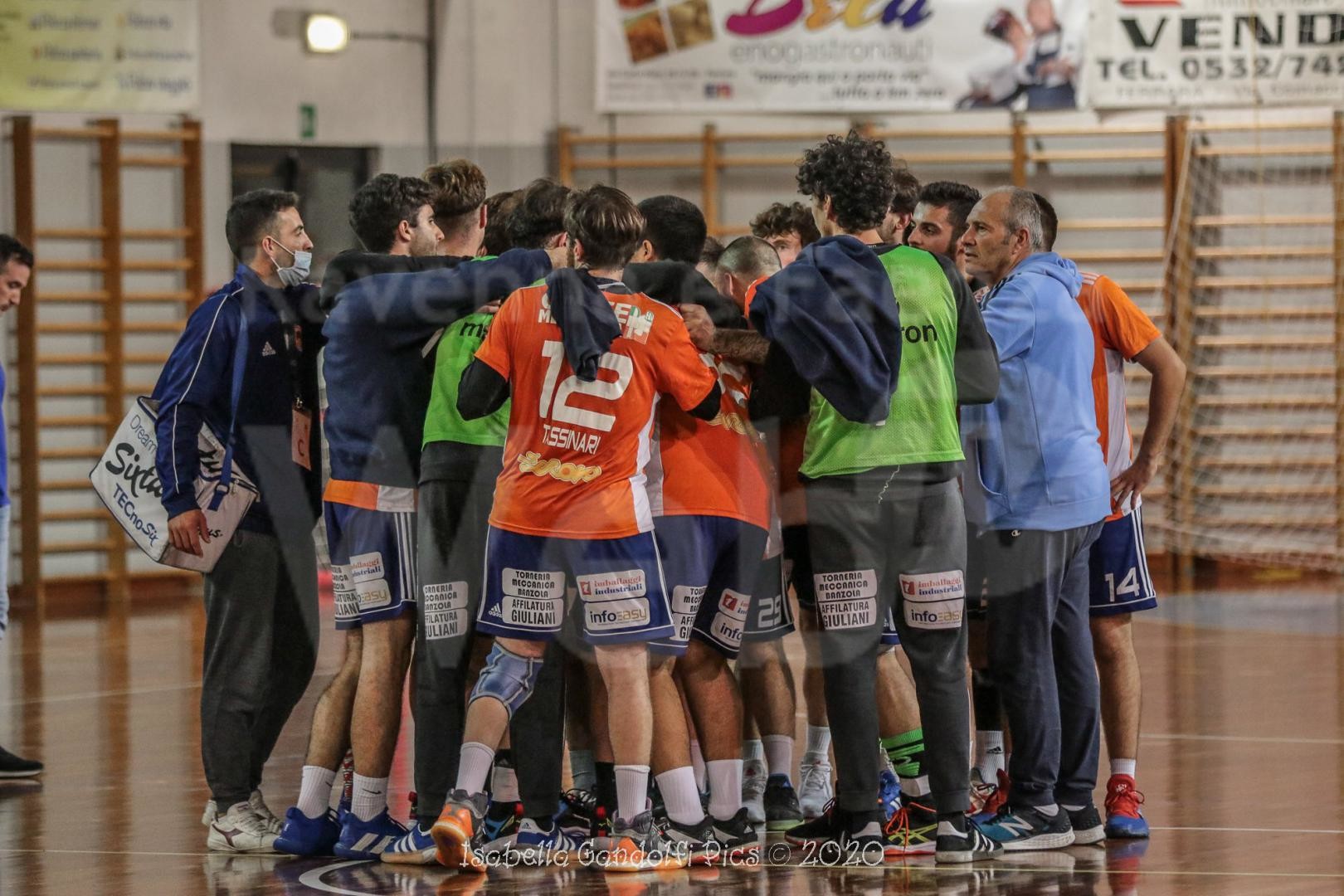 Primo tempo assolutamente equilibrato, in cui il massimo vantaggio risulta il +2 per Ferrara sul 5-3 del 10’, oltre al 2-0 delle prime battute. Nella ripresa esce la determinazione arancioblu che scappa sul massimo vantaggio di +6 sul 21-15 al 20’, con la rete da pivot di Gollini. Poi un’accelerazione, l’ultima, dei locali accorcia il divario che resta, comunque, di 4 lunghezze sul 21-17 al 22’, con la squadra in inferiorità per l’esclusione di 2’ di Mazzanti. Anzichè vacillare, i ragazzi di Tassinari restano lucidi e realizzano splendide reti con Boukhris, Bandini, Chiarini e Tassinari per il rotondo 25-20 finale.