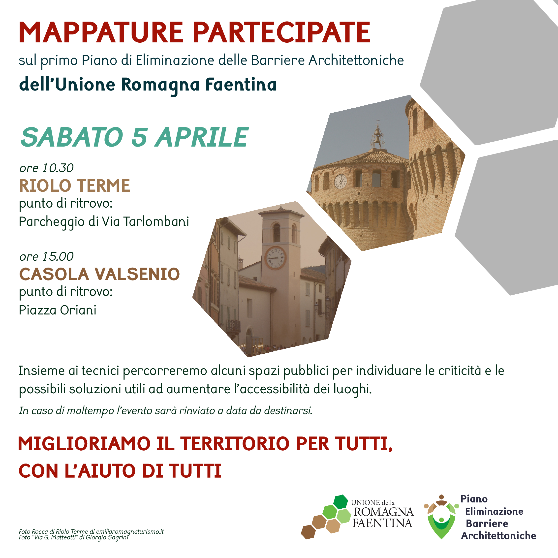Sabato 5 aprile si terranno a Riolo Terme e Casola Valsenio due nuove passeggiate partecipate nell’ambito del Piano di Eliminazione delle Barriere Architettoniche (PEBA), proseguendo il percorso avviato con gli incontri pubblici di febbraio nei Comuni dell’Unione della Romagna Faentina.
