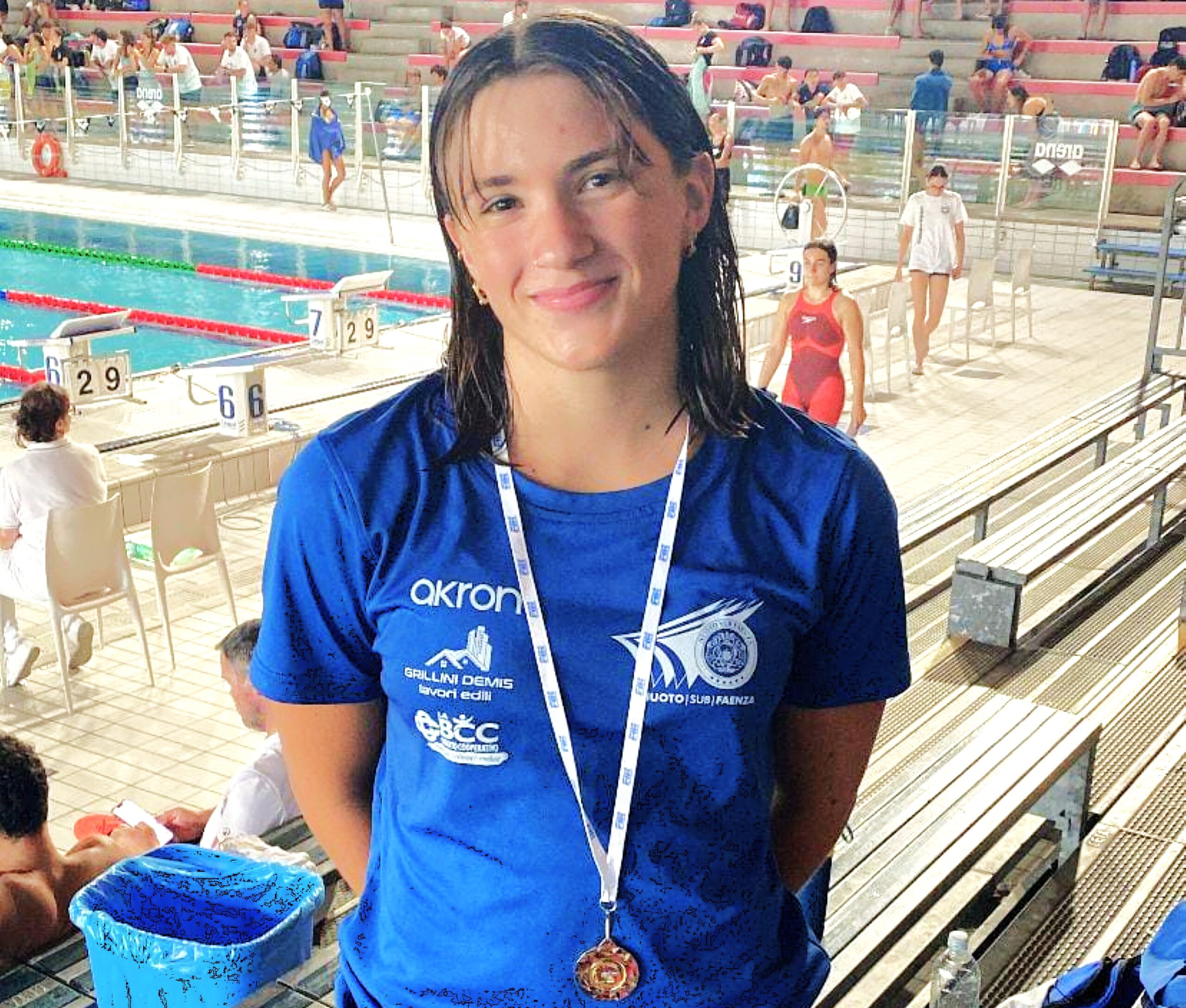 Con un bel quindicesimo posto su 36 nella classifica per società e due preziose medaglie individuali di Penelope Sangiorgi e di Mattia Pini il Nuoto Sub Faenza ha onorato la partecipazione alle Finali per l’Emilia-Romagna del Campionato Regionale di Categoria in Vasca Lunga (CRCVL) nello scorso weekend a Riccione, dove si è avuta la conferma che Alberto Fabbri sarà della partita al Campionato italiano. Allo Stadio del Nuoto la spedizione di nuotatrici e i nuotatori faentini delle categorie Seniores, Cadetti, Juniores e Ragazzi guidata dagli allenatori Marco Fregnani e Fabrizio Zaniha visto Penelope Sangiorgi (categoria Cadette, 2007) salire sul secondo gradino del podio nei 100 metri dorso e piazzarsi quarta nei 200 dorso e Mattia Pini (Juniores, 2008) agguantare il bronzo nei 200 farfalla. All’ultimo impegno collettivo stagionale, dove gli atleti del Nuoto Sub Faenza hanno fatto registrare diversi miglioramenti, sono da menzionare i quarti posti di Giada Minelli (Cadette, 2008) nei 400 e negli 800 stile libero e di Linda Martelli (Ragazze, 2012) nei 200 misti. Alberto Fabbri (Ragazzi, 2011) si era qualificato con il secondo tempo per la finale dei 100 farfalla, alla quale non ha però potuto partecipare a causa di un problema fisico che gli ha anche impedito di scendere in acqua per le gare di sabato e di domenica.