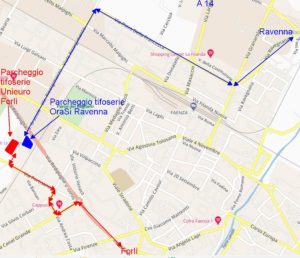 La tifoseria ravvenate raggiungerà il parcheggio seguendo via Ravegnana, via Gatti, via San Silvestro, via Piero della Francesca, via Risorgimento, via Graziola e piazzale Tambini.