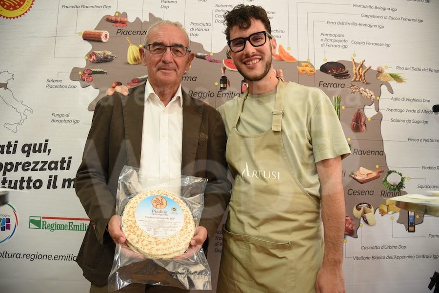 Nello spazio della Regione Emilia-Romagna e con il supporto di Casa Artusi, centro di cultura gastronomica di Forlimpopoli, è stata proposta e presentata al pubblico una degustazione guidata di Piadina Romagnola Igp. A illustrare il prodotto simbolo della Romagna è stato il Presidente del Consorzio di Promozione e Tutela della Piadina Romagnola Igp, Alfio Biagini, che ha spiegato la versatilità del prodotto e la sua facilità di abbinamento con tante tipicità del territorio a partire dallo Squacquerone di Romagna, da sempre in duetto perfetto.