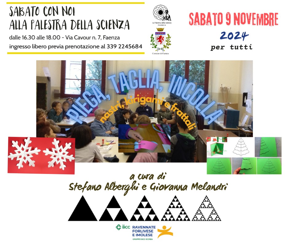 Sabato 9 novembre, nell’ambito della rassegna “Sabato con Noi 2024”, alla Palestra della Scienz, in via Cavour 7, è in programma l’incontro “Piega, taglia, incolla – nastri, kirigami e frattali”, curato da Stefano Alberghi e Giovanna Melandri.