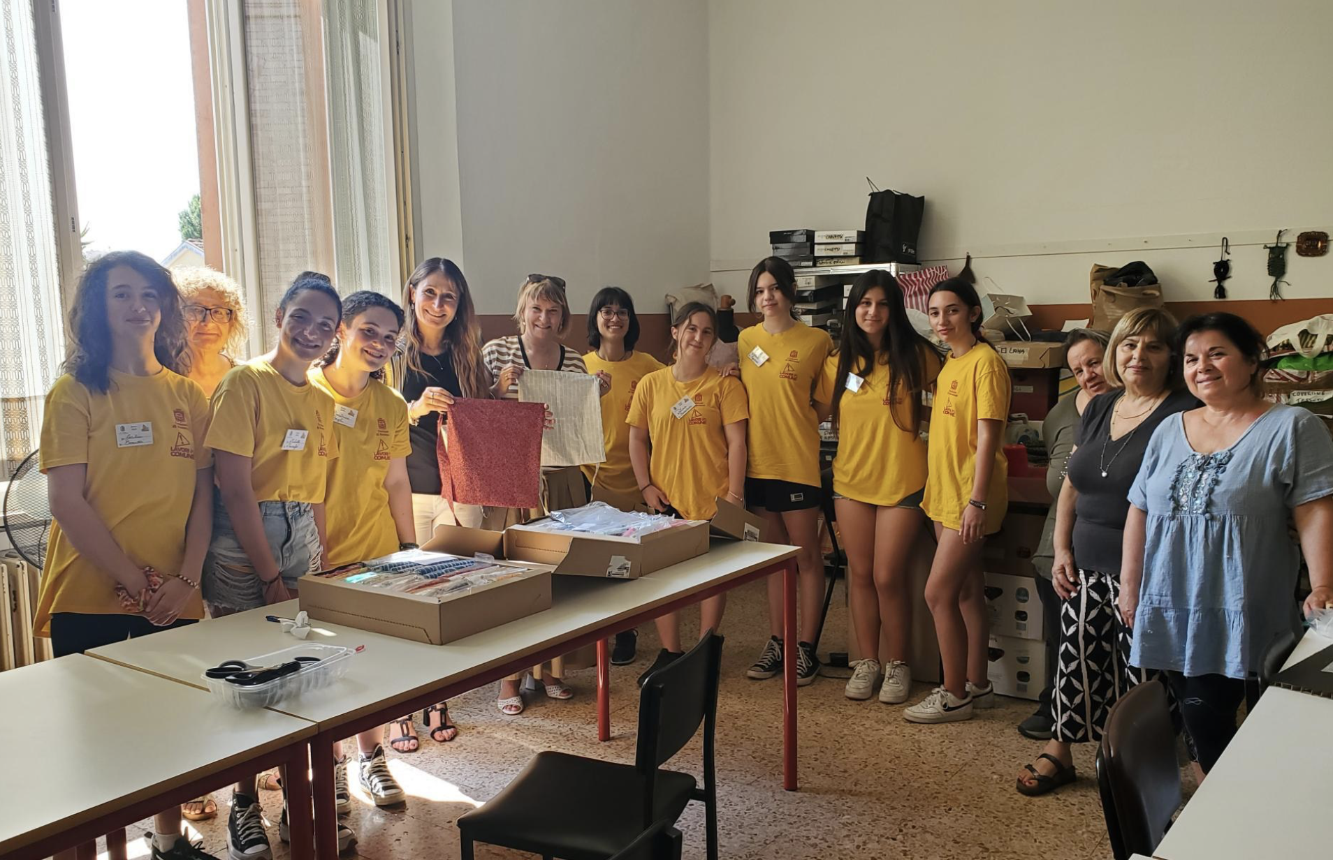 Le magliette gialle, Anna, Aurora, Beatrice, Cecilia, Chiara C., Chiara G., Ester, Lucia, Martina, Matilde, Sara, Michela, Michelle, Nicolle, Penelope, coadiuvate dalle tutor Adriana, Angela, Anna, Liberata, Meri e Serena, volontarie della Banca del Tempo, hanno realizzato borsine porta drenaggio per pazienti oncologici e, in autunno, avverrà la consegna ufficiale al reparto di Oncologia dell’ospedale di Ravenna.