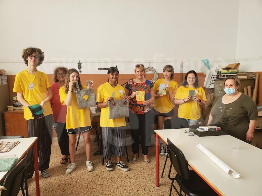 Le magliette gialle Alessia, Cesare, Diana, Emma, Gina, Giulia, Ilaria, Nusrat Jahan, e Sara, coadiuvate dalle tutor Liberata Cervino, Meri Esposito, Serena Piazza e Roberta Cicognani, volontarie della Banca del Tempo, hanno realizzato borsine porta oggetti di varie misure, che in autunno verranno consegnate alle Case di Riposo e ASP, per gli ospiti di queste strutture.