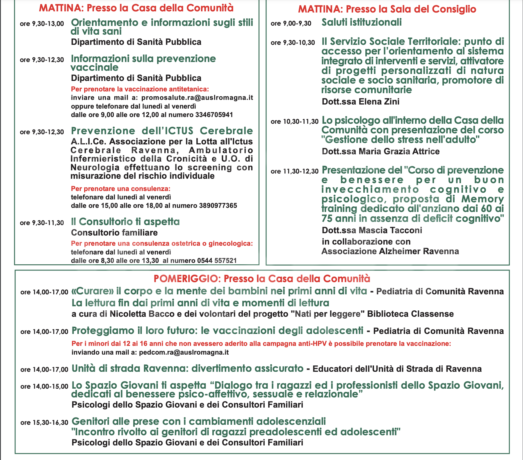 Il pomeriggio vedrà protagonisti i più giovani: iniziative di prevenzione vaccinale per gli adolescenti, attività di promozione della lettura fin dalla più tenera età, attività dell’unità di strada di Ravenna e degli psicologi dello spazio giovani e dei consultori familiari.