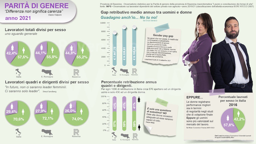 Il progetto, che ha visto impegnate 8 classi delle scuole secondarie di 2° grado, valorizza la creatività e la sensibilità dei partecipanti nel creare un’infografica, mirando ad innescare nei ragazzi e nelle ragazze spirito critico per comprendere e combattere i pregiudizi e le visioni stereotipate presenti nella società, analizzando le statistiche, sviluppando idee che porteranno al confronto ed alla sensibilizzazione. Il progetto è stato promosso dalla Consigliera di Parità della Provincia di Ravenna e dalla Provincia di Ravenna. Nel progetto compartecipano gli enti aderenti al progetto “Osservatorio statistico per la parità di genere della provincia di Ravenna”.