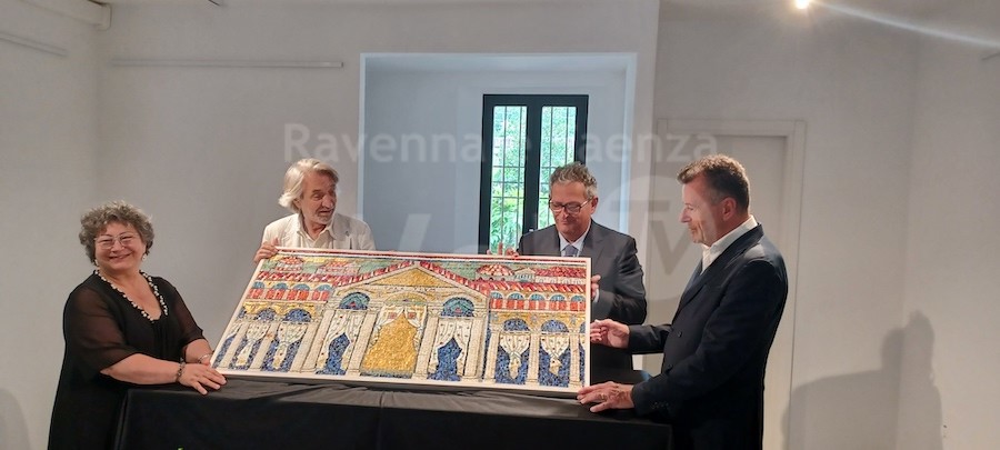 L’opera, realizzata da Dis-Ordine, l’Associazione di mosaicisti diretta dal professor Marcello Landi. L’opera che rappresenta il “Palatium teodoriciano” presente in Sant’Apollinare Nuovo con, sullo sfondo, i monumenti della Ravenna dei goti. Dopo i saluti dei Claudia Agrioli, gentile ospite e presidente di Galleria Pallavicini22, sono intervenuti il presidente provinciale Roberto Scaini che ha sottolineato come la tessera sarà distribuita ad oltre 60mila famiglie di iscritti all’Associazione dei Piccoli Proprietari Immobiliari, un invito a visitare l’antica capitale dell’impero d’occidente. Marcello Landi ha dato informazioni sulla lunga vita del mosaico che ha visto, nei primi tempi, vistosi rimaneggiamenti per cancellarne i richiami alla religione ariana, “Ma il fantasma di Re Teodorico è ancora lì, dietro la tenda centrale in oro”, ha assicurato Landi.