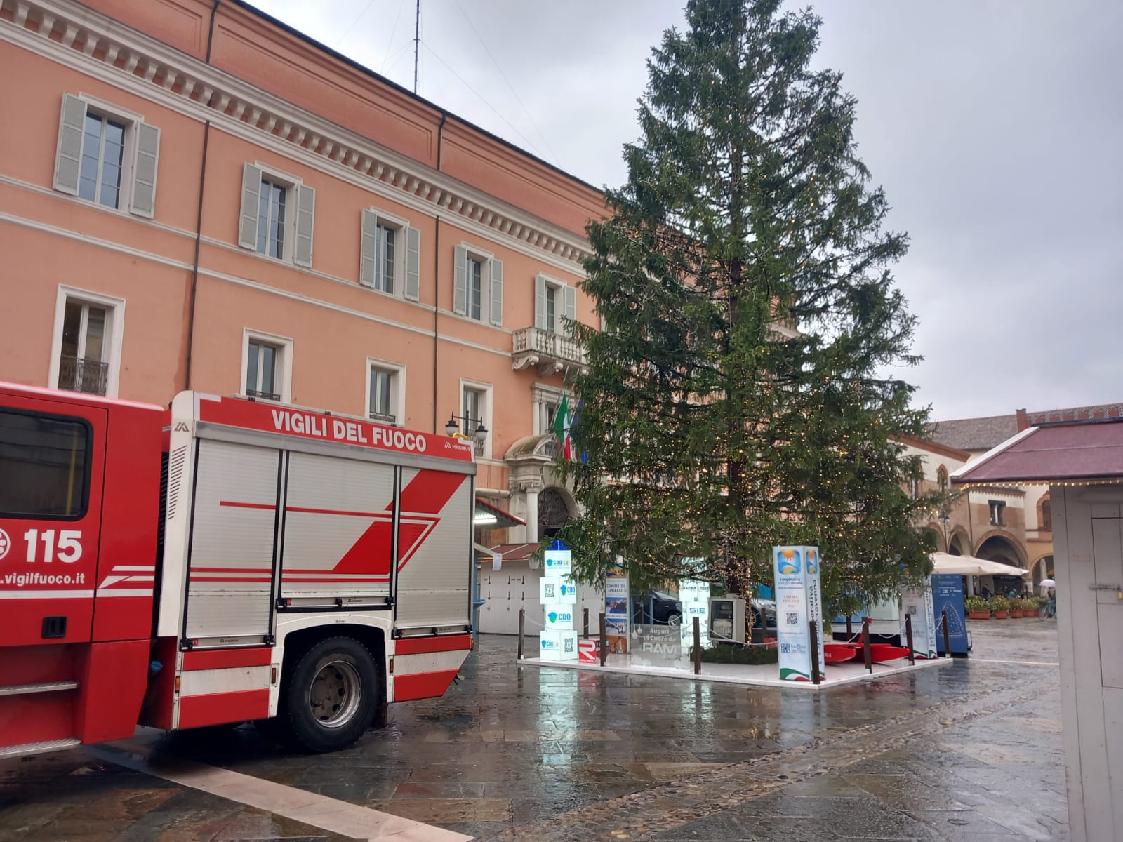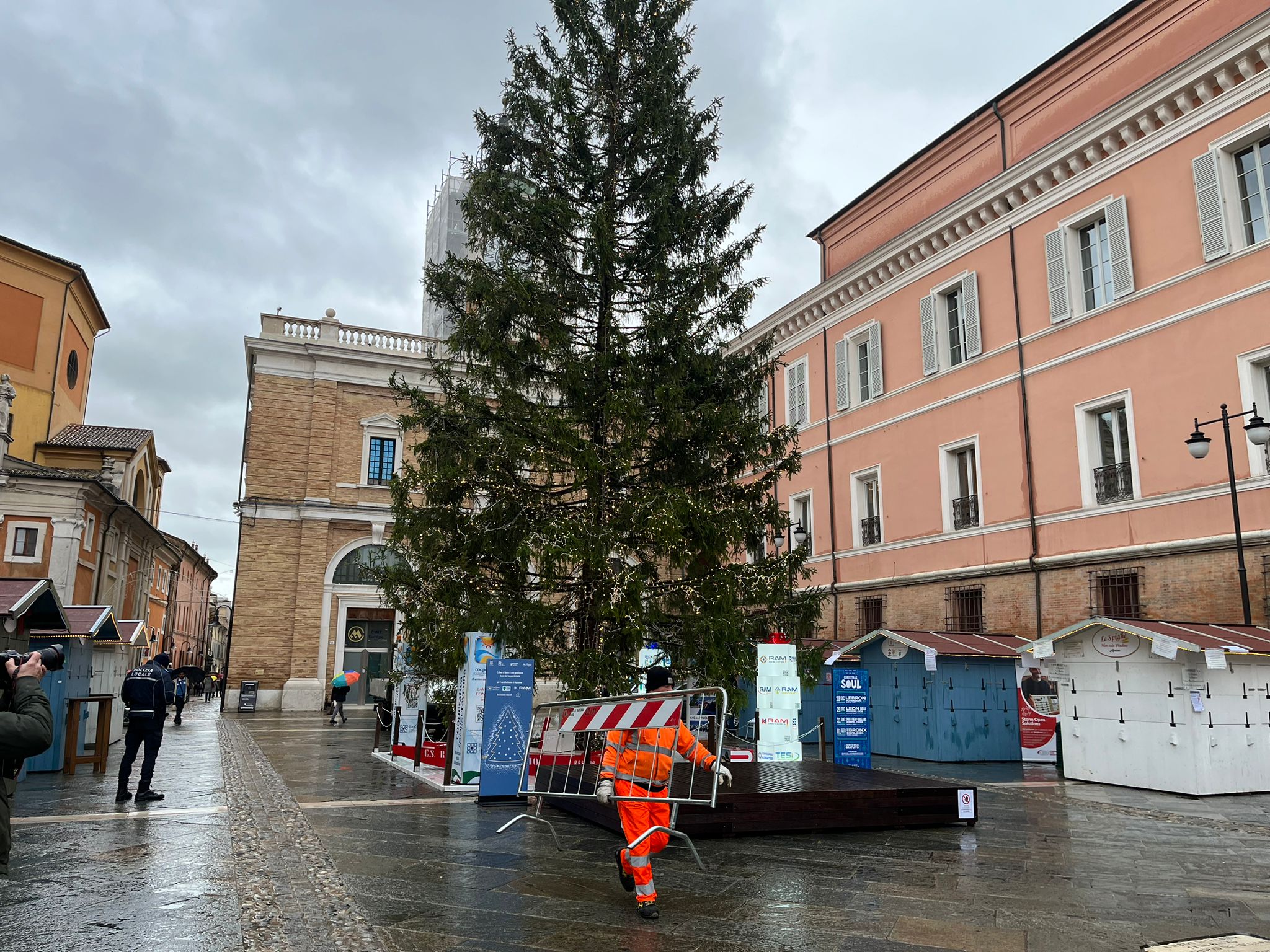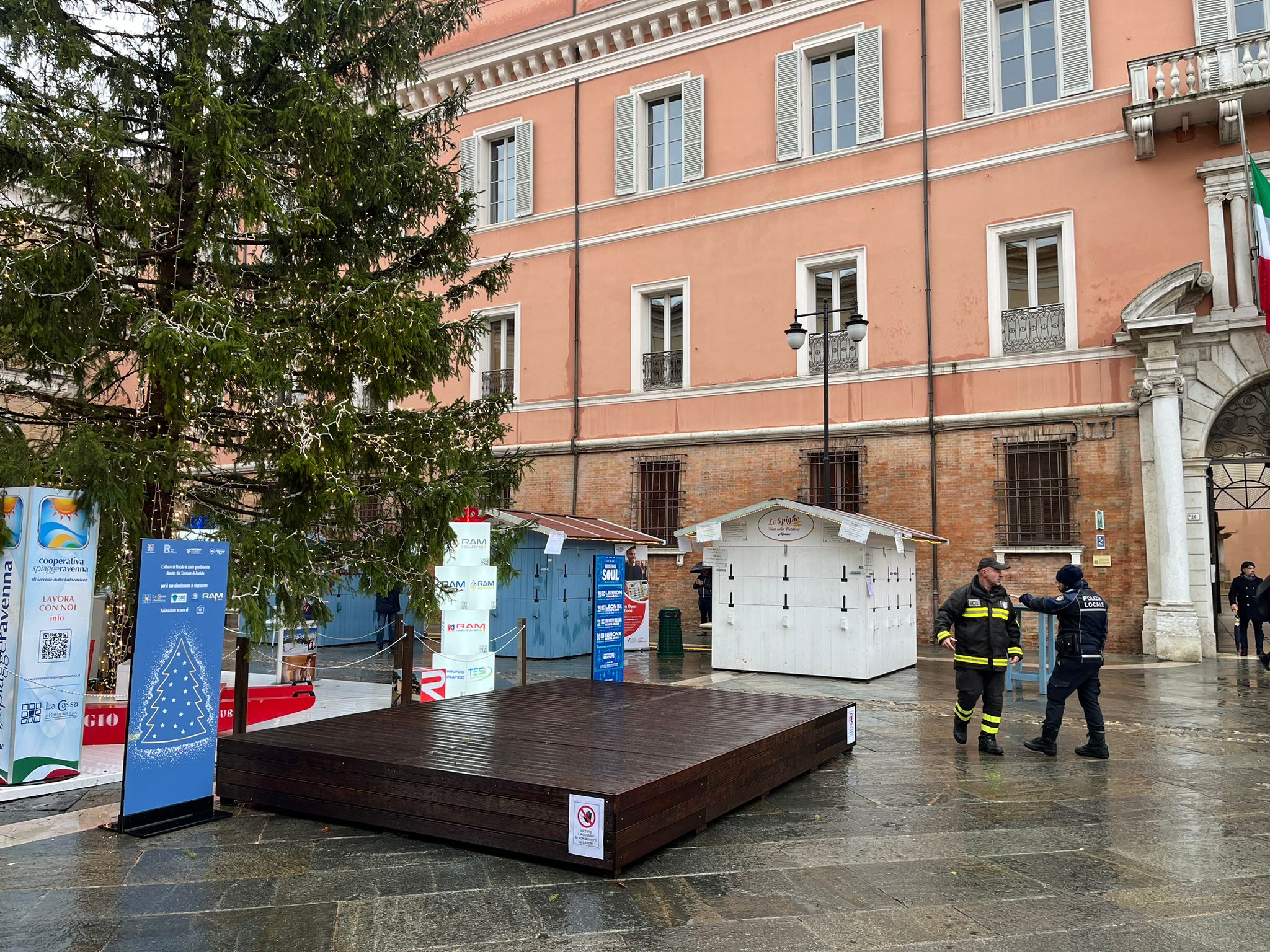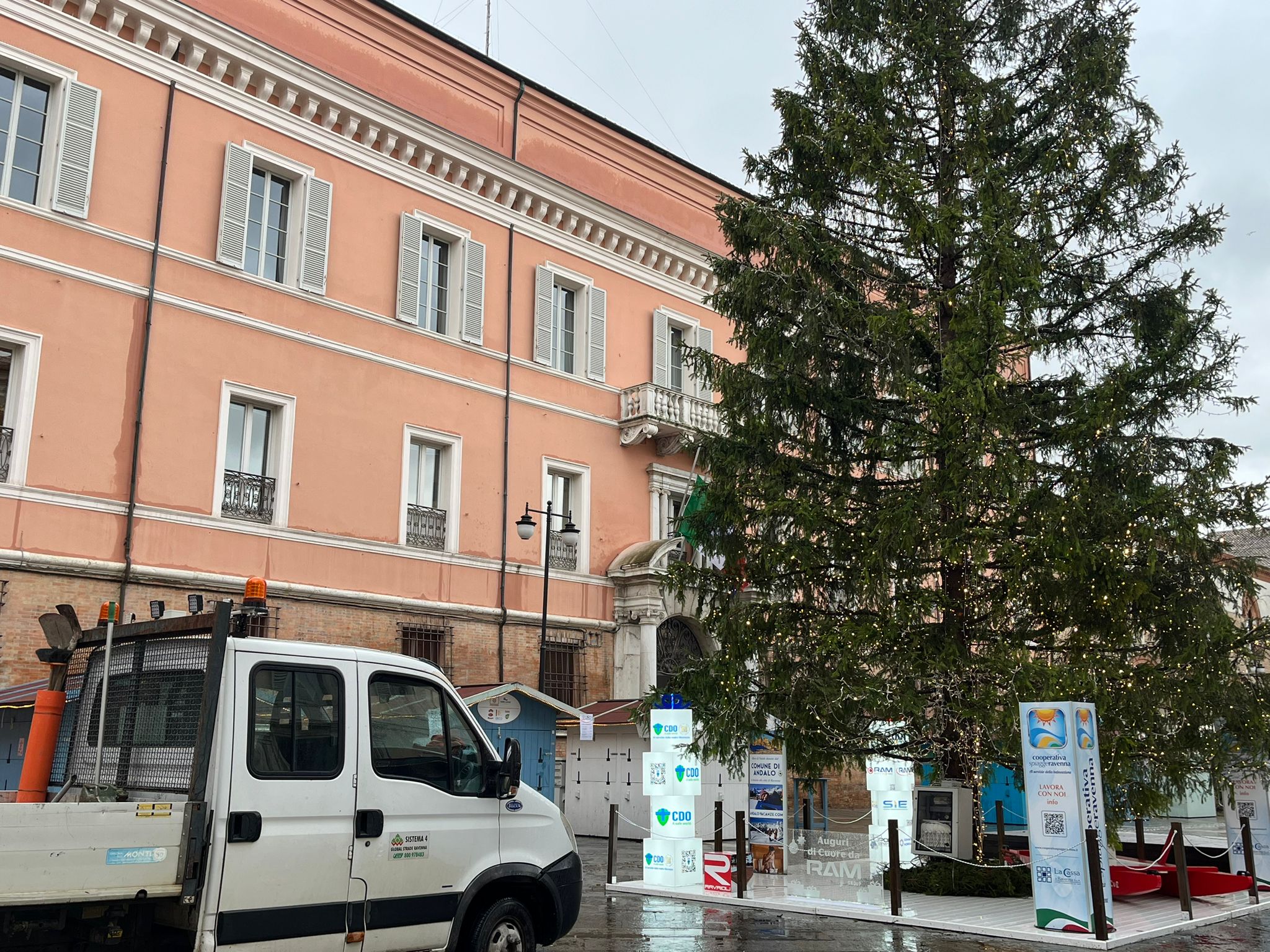 L’albero di Natale in Piazza del Popolo si è inclinato nella mattinata di lunedì, a causa probabilmente del maltempo. Il simbolo natalizio ha iniziato a pendere pericolosamente in direzione del municipio. Necessario è stato l’intervento dei Vigili del Fuoco e della Polizia Locale. La piazza è stata transennata, i capanni ai piedi dell’albero chiusi. Sono stati quindi predisposti dei lavori in urgenza per rafforzare la base dell’albero e per migliorarne la stabilità, anche in vista del forte vento previsto per le prossime ore. La Protezione Civile ha infatti diramato un’allerta meteo per tutto il territorio ravennate. Finché i lavori non saranno ultimati, non sarà possibile avvicinarsi all’albero.