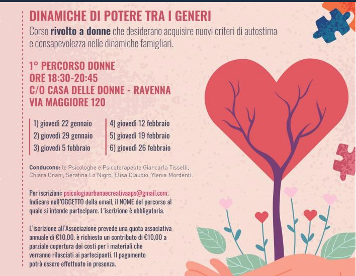 Il percorso sarà condotto dalle psicologhe e psicoterapeute Giancarla Tisselli, Chiara Gnani, Serafina Lo Nigro, Elisa Claudio e Ylenia Mordenti ed è svolto in collaborazione con il Comune di Ravenna – assessorato alle Politiche e culture di genere, Linea Rosa e Casa delle Donne.