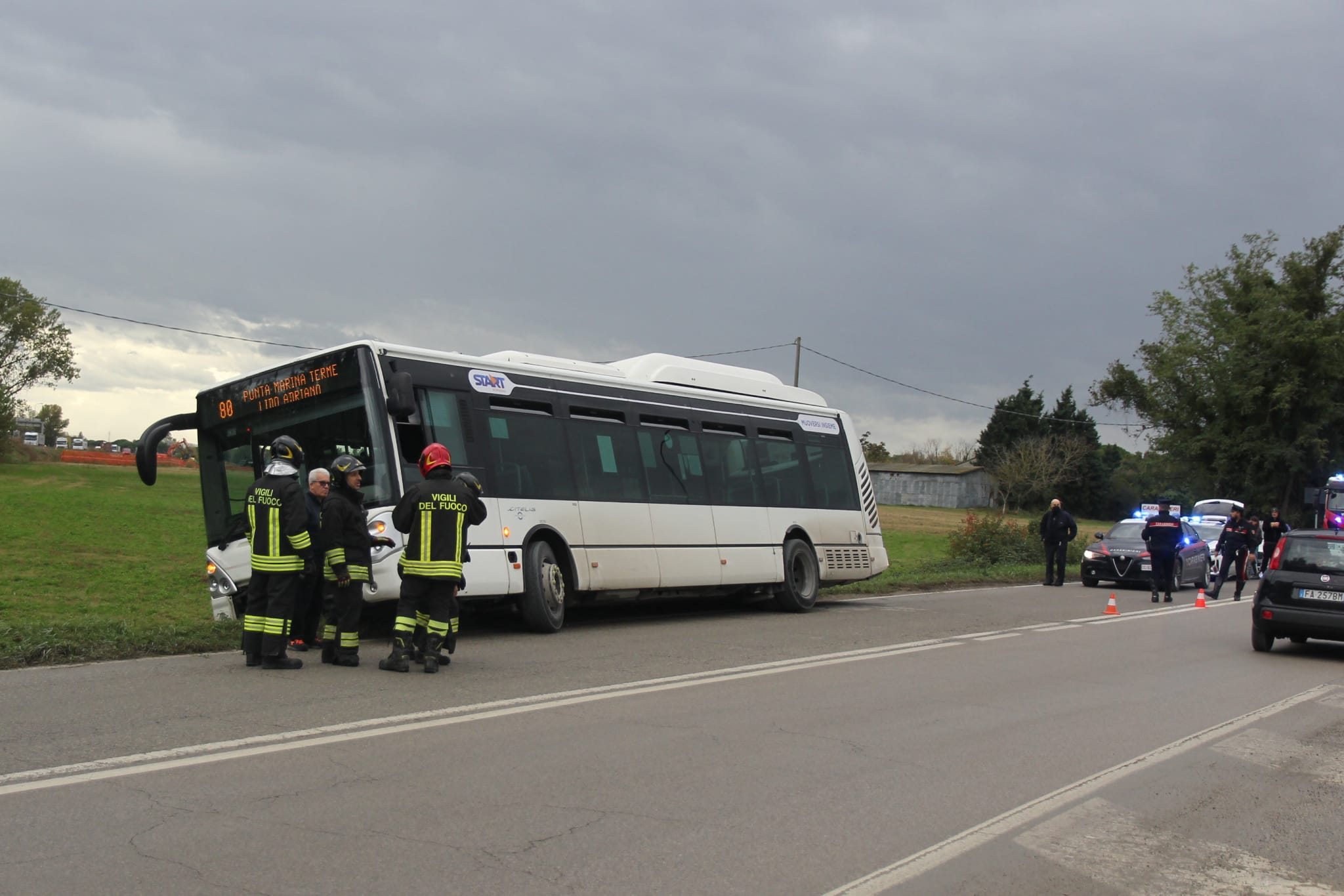 Un pullman della linea 80, con a bordo una quindicina di passeggeri diretti ai Lidi, è uscito parzialmente di strada, inclinando pericolosamente le ruote del lato destro nel fosso a margine della carreggiata.