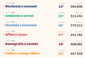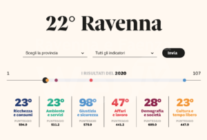 La classifica del 2020 vede al primo posto Bologna, che è prima in livello di Ricchezza e Consumi. Al secondo posto troviamo invece Bolzano, seguita da Trento che si piazza sul terzo gradino del podio. Ravenna è invece al 22esimo posto in classifica, migliorando di 17 posizioni rispetto al 2019. La categoria Ricchezza e Consumi è quella dove Ravenna registra il risultato migliore, insieme all’are tematica che riguarda l’ambiente e i servizi. male invece per quanto riguarda la categoria Giustizia e sicurezza, per la quale Ravenna è classificata 98esimo posto a livello nazionale.