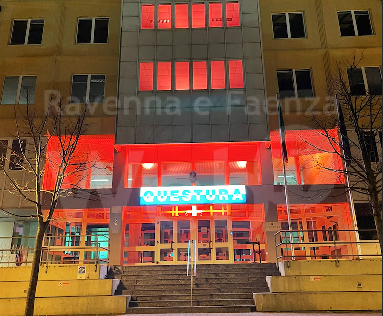 Una luce colora di arancione la facciata anteriore della Questura, il colore scelto come simbolo di un futuro senza violenza basata sul genere.