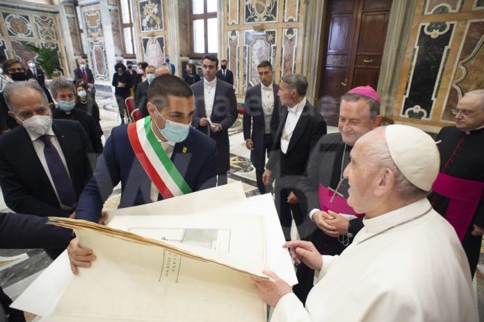 Papa Francesco ha ricevuto ieri per un’udienza privata una delegazione proveniente da Ravenna per la benedizione della croce donata nel 1965 da Paolo VI per la tomba di Dante che verrà ricollocata nella tomba del Poeta.