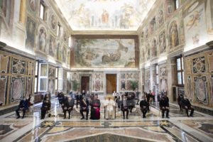 Dopo il ritrovo in Piazza San Pietro, la delegazione in attesa di incontrare il Santo Padre ha potuto visitare l’interno della chiesa di San Pietro. Successivamente, dopo aver percorso una lunga e maestosa scalinata, il gruppo è giunto alla Sala Clementina, stupenda stanza completamente affrescata e utilizzata dal Vaticano per le udienze private ma anche per esporre le salme dei pontefici prima della sepoltura. L’arcivescovo Lorenzo Ghizzoni ha preso posto sul lato sinistro della sala, e dopo l’ingresso di Papa Francesco ha introdotto il motivo delle visita,ringraziando il Papa per valorizzare le celebrazioni dantesche e l’opera del Sommo Poeta, così importante per ognuno di noi.