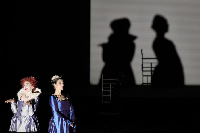 Le due attrici si immergono in un’epoca ricca di scrittori e artisti, da Shakespeare a Marlowe, ma dove «la vita è breve, insopportabile il fetore dei castelli, potenti i conflitti, frequenti le guerre, imprevedibili i tradimenti, violenta la peste, implacabile la sete di ricchezza e potere, sorprendenti le ascese e le cadute». Un’epoca in cui i destini delle donne, anche se ai vertici della scala sociale, sembravano segnati in modo implacabile. Da una parte, Elena Bucci si fonde con l’ambigua ed elegante Elizabeth, fragile e forte al tempo stesso, forse illegittima, comunque la sovrana più potente d’Inghilterra; dall’altra Chiara Muti si cala nel ruolo della cattolica Mary Stuart, regina di Scozia, bella e altissima eppure debole e passionale, che si rifugia in Inghilterra affidandosi alla protezione della cugina che, invece, la terrà prigioniera per vent’anni fino a condannarla al patibolo, l’8 febbraio 1587. Nel 1603, alla morte di Elizabeth, che mai ebbe figli, sul trono salirà il figlio di Mary, James Stuart, che per la prima volta riunirà i regni di Inghilterra e Scozia