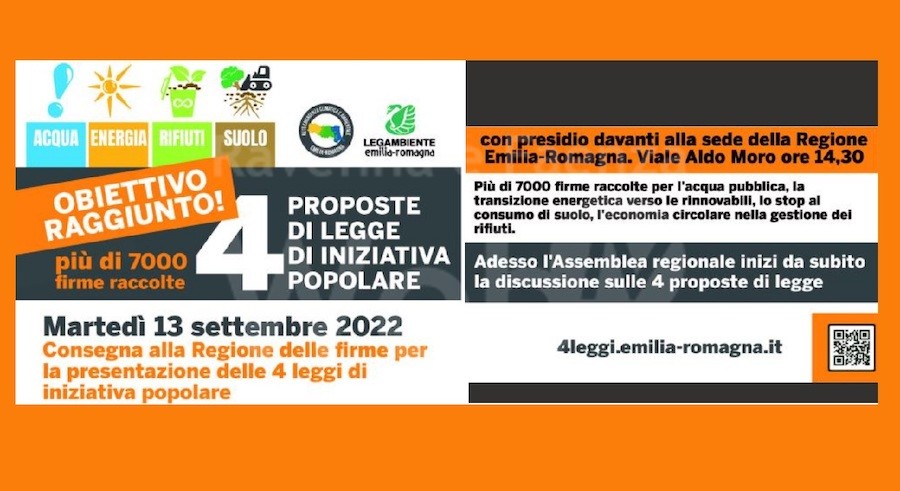 “In primavera come Ravenna in Comune abbiamo aderito e invitato a sottoscrivere 4 proposte di legge regionale di iniziativa popolare in tema di acqua, energia, rifiuti e tutela del suolo. L’iniziativa è stata lanciata da RECA (Rete per l’Emergenza Climatica e Ambientale Emilia-Romagna) e da Legambiente Emilia-Romagna con l’obbiettivo di portarle in discussione presso l’assemblea legislativa dell’Emilia Romagna. Si tratta di leggi per: