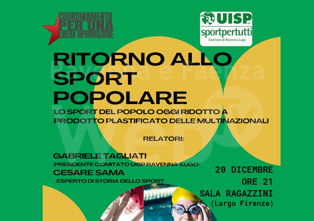 “Ravenna in Comune ha aderito al “Coordinamento per una Libera Informazione” che ha organizzato per domani, 20 dicembre, un incontro con Alberto Tagliati, presidente UISP Ravenna-Lugo, e Cesare Sama, esperto di storia dello sport. Durante l’incontro verrà affrontato l’argomento che dà il titolo alla serata: “Ritorno allo sport popolare. Lo sport del popolo oggi ridotto a prodotto plastificato delle multinazionali”. L’incontro si svolgerà dalle ore 21 presso la Sala Ragazzini in Largo Firenze, a Ravenna, dietro la chiesa di San Francesco.