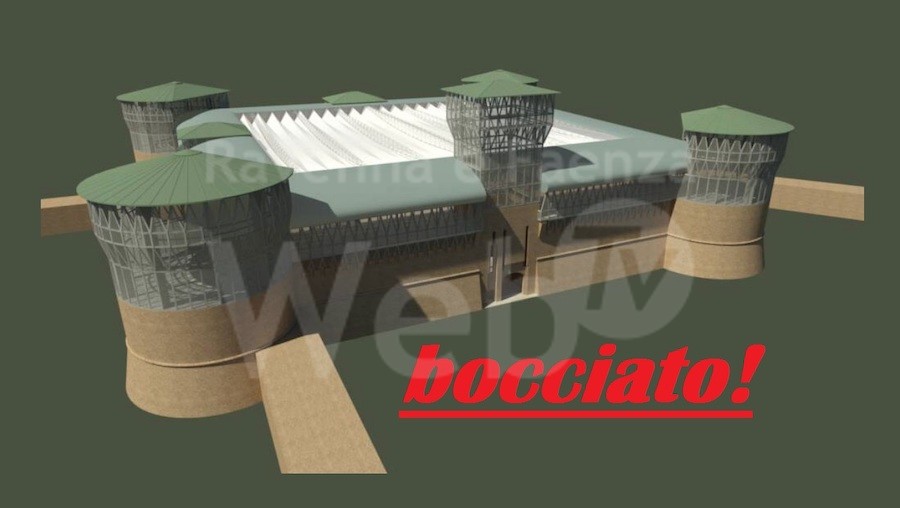 Un terrificante rendering aveva accompagnato l’annuncio due anni fa. Il progetto prevedeva la realizzazione di una struttura metallica reticolare che avrebbe sopraelevato i torrioni e i camminamenti, a cui si sarebbe aggiunto un tetto mobile a copertura dell’intera area ora scoperta. 8 milioni di euro, cinque statali e 3 comunali e poi un altro per le mura, il costo preventivato. Ora, fortunatamente, non bastano più.