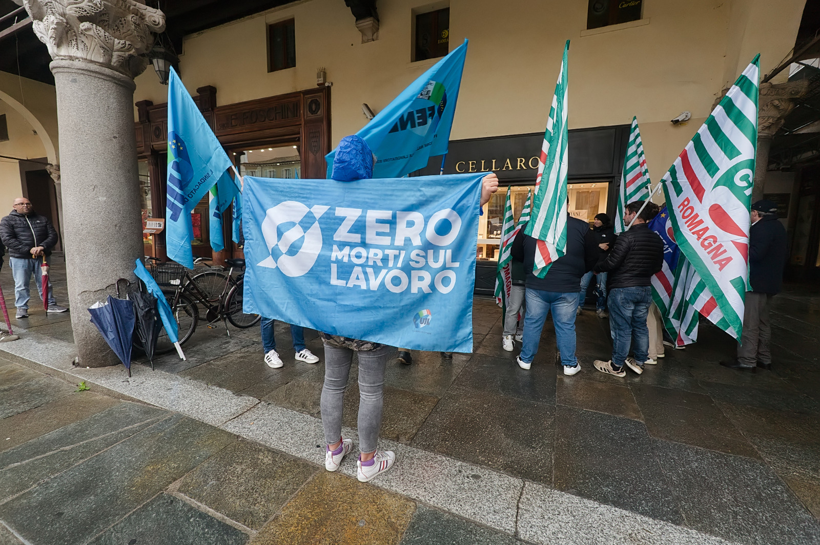 Presidio dei sindacati questa mattina, sotto la pioggia in piazza del Popolo a Ravenna, per ricordare Giuseppino Zuccoli, il 67enne autotrasportatore marchigiano morto venerdì 17 ottobre nel piazzale della Sapir, durante le operazioni di carico e scarico dell’argilla.