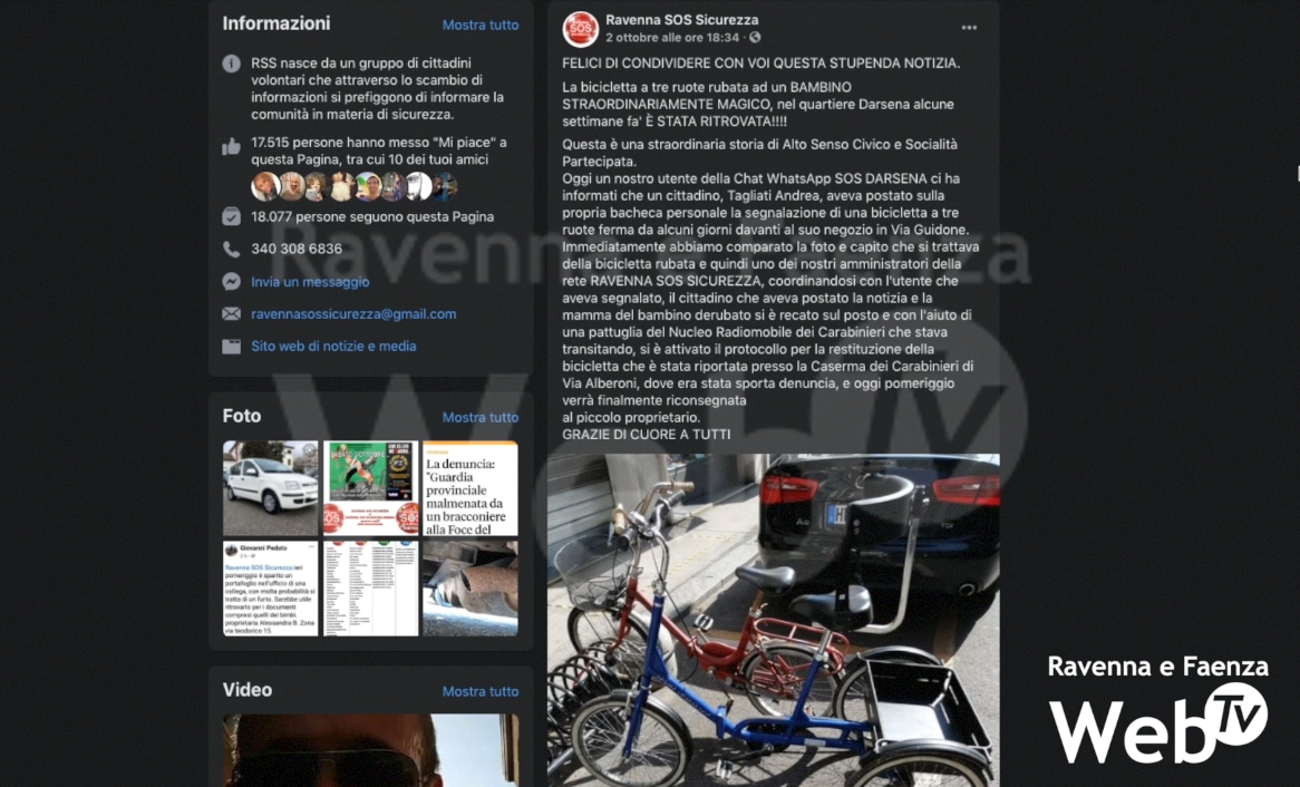 Dalle chat e dai gruppi Facebook nati per condividere notizie e segnalazioni in merito a furti e altri episodi di illegalità, in mezzo a molte notizie di cronaca nera, arrivano anche notizie positive. A testimoniarlo è ancora il gruppo Ravenna SOS Sicurezza. Gli utenti infatti sono riusciti a ritrovare una bicicletta a tre ruote rubata ad ragazzo con disabilità dalla sua abitazione in zona Darsena. Non solo, scorrendo fra le varie segnalazioni, si susseguono sempre di più le notizie di anziani che riescono a smascherare truffatori o a evitare di cadere vittime dei loro raggiri. Una consapevolezza raggiunta grazie alla grande attività di sensibilizzazione messa in atto dalle forze dell’ordine, rilanciata e spalleggiata anche da gruppi come Ravenna SOS Sicurezza.