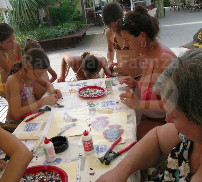 I laboratori di “Mosaico in tour”, giunti alla 17a edizione, nascono da un’idea della mosaicista Silvana Costa e hanno un grande successo. Come un’officina su quattro ruote portano in spiaggia e nei campeggi, i corsi di mosaico organizzati con insegnanti, strumenti professionali, artisti e tessere di vetro colorato.