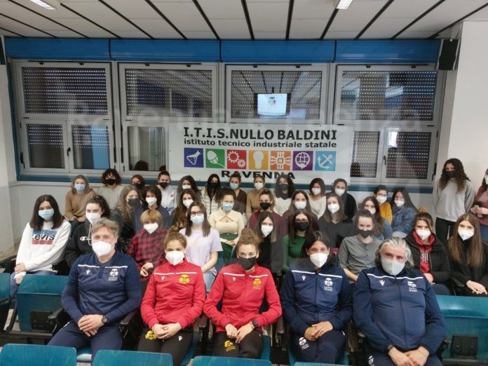 Nel corso dell’incontro che ha visto la partecipazione del Presidente del Ravenna Women Samuel Gasperoni, i responsabili tecnici Massimo Ricci e Sandro Bonfiglioli, la dirigente Alessandra Ghirardelli e le atlete Giada Burbassi e Nicol Gianesin sono emerse le opportunità di crescita delle giovani attraverso lo sport.