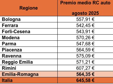 Ecco i premi medi RC auto rilevati da Facile.it ed Assicurazione.it ad agosto 2025 in Emilia-Romagna: