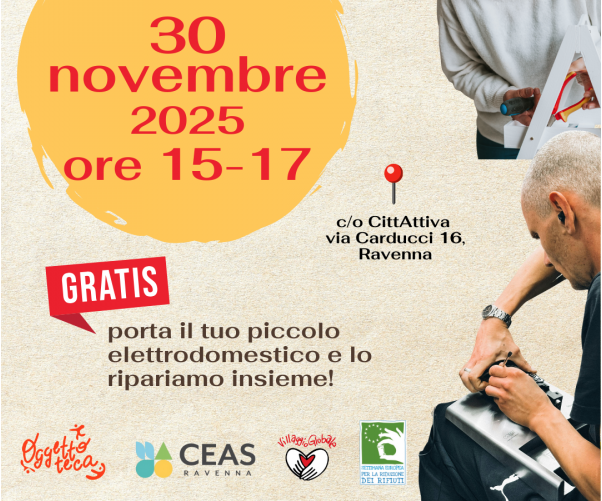 Il Repair Café è un’iniziativa che si inserisce nella missione dell’Oggettoteca, progetto del Ceas, Centro educazione alla sostenibilità del Comune di Ravenna, coordinato dalla cooperativa sociale Villaggio Globale. Un luogo dove la condivisione degli oggetti e l’apprendimento di competenze di riparazione rappresentano alternative concrete al modello consumistico.