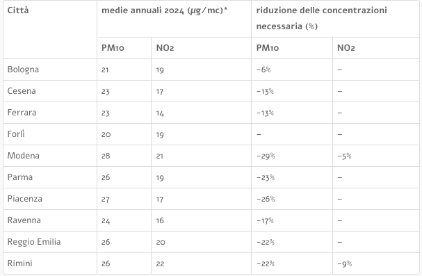 In Emilia-Romagna ben 5 città su 9 hanno superato i giorni di sforamento del limite di PM10; Modena è la peggiore con 52 sforamenti in un anno, seguita da Piacenza e Rimini a 40, Ferrara a 38 e Ravenna a 37.