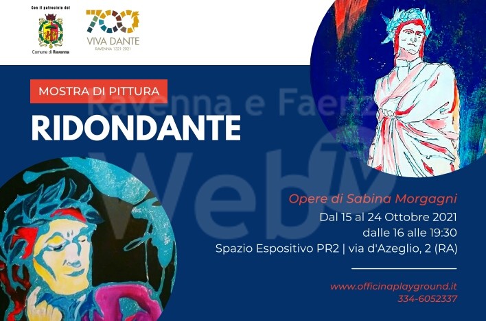 “RidonDante”, la personale di Sabina Morgagni in mostra dal 15 al 24 ottobre 2021, dalle 16 alle 19e30, allo Spazio Espositivo “PR2” di via D’Azeglio n. 2, realizzata con il patrocinio del Comune di Ravenna nell’ambito delle celebrazioni del 700nario delle morte, ci restituisce un “Dante” grande osservatore, tanto da riuscire tramite la Divina Commedia a restituire l’immagine di una mente attenta, indipendente e lucida. Un’immagine di Dante ridente perché geniale come il Medioevo stesso. Ridente poiché internamente abbastanza libero e sapiente da creare un’opera che partisse dalle basi del pensiero Cristiano per superarlo ed approdare ad una visione moderna che comprendesse domande ed allusioni “scomode”.