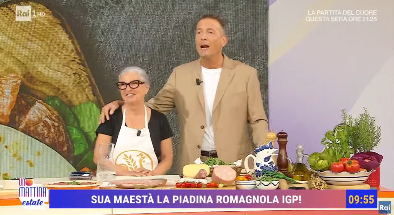 Riflettori nazionali per la Piadina Romagnola Igp. Nei giorni scorsi il prodotto simbolo della Romagna è stato protagonista nella trasmissione Unomattina su Rai 1 condotta da Alessandro Greco con una esclusiva finestra di ben 14 minuti. Ambasciatrice in studio la cervese Milena Pagliacci, socia del Consorzio di Promozione e Tutela della Piadina Romagnola, che ha fatto vedere in diretta come si realizza la Piadina Romagnola Igp attraverso il giusto dosaggio degli ingredienti, secondo il disciplinare, nonché le modalità di esecuzione e farcitura.