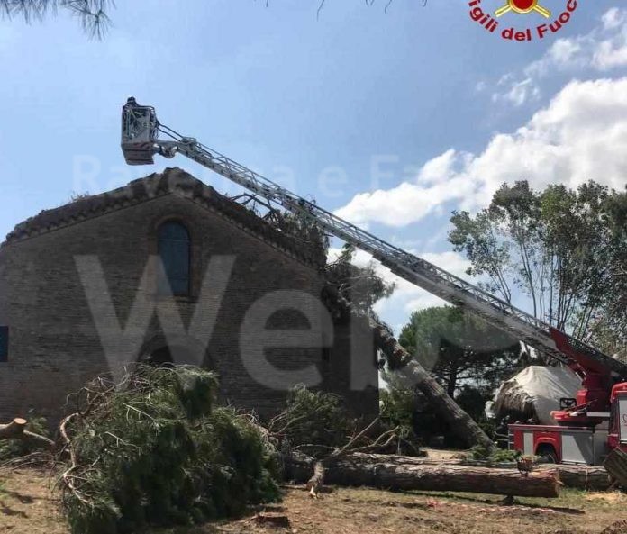 Questa mattina una squadra dei Vigili del Fuoco del distaccamento di Cervia, con l’ausilio dell’autoscala e autogru della sede centrale di Ravenna, ha provveduto alla rimozione di diversi pini appoggiati alla chiesa Madonna del pino di Cervia, dopo gli eventi climatici occorsi nelle scorse settimane.