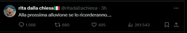 All’Adnkronos Rita dalla Chiesa ha provato a spiegare: “In questo periodo sono stata molto vicina all’Emilia-Romagna, una terra che ha vissuto momenti difficilissimi. Tante persone hanno perso tutto a causa dell’alluvione. È stata una sofferenza condivisa da tutti noi. Da esponente del centrodestra, speravo che questo dramma potesse essere anche un momento di riflessione, soprattutto per gli emiliani». Ancora: «L’Emilia-Romagna è sempre stata una terra “rossa”, ma se la sinistra, che ha governato per anni, ha portato a questa situazione, forse è arrivato il momento di interrogarsi. Sono stati gestiti tanti fondi pubblici, ma pochi sono stati realmente investiti per mettere in sicurezza il territorio e prevenire tragedie come questa”.