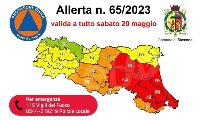 Dalla mezzanotte di oggi, venerdì 19 maggio, alla mezzanotte di domani, sabato 20, sarà attiva nel territorio del comune di Ravenna l’allerta meteo numero 65 emessa dall’Agenzia regionale di protezione civile e da Arpae Emilia-Romagna. L’allerta è rossa per criticità idraulica e arancione per criticità idrogeologica e proroga di altre 24 ore l’allerta 64 emessa nella giornata di ieri.