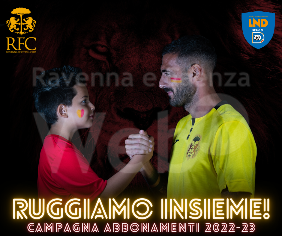 Per un Ravenna che vuol essere protagonista con ogni avversario, la campagna si presenta con un claim altrettanto aggressivo: “Ruggiamo insieme!”. Uno stimolo ad ogni giallorosso a correre sugli spalti a sostenere con forza i leoni che scenderanno in campo per difendere quei colori che scaldano l’anima ed il cuore di tutti noi ravennati.